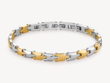 Polotuhý náramek z leštěné nerezové oceli 316L a pvd povlaku ze 14K zlata. Tento náramek je vhodný pro muže, kteří mají rádi kombinaci bílé ocelové barva a zlatého PVD povlaku.