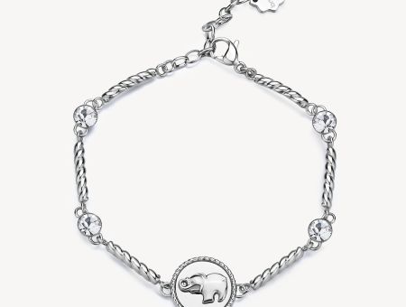Polotuhý náramek z nerezové oceli 316L se středovým štítkem ve tvaru slona a čirými krystaly.