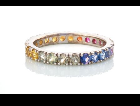 Prsten z bílého zlata s přírodními safíry odstínů od růžové, přes červenou, oranžovou, žlutou, zelenkavou a modrou. Kameny jsou osázeny kolem dokola.