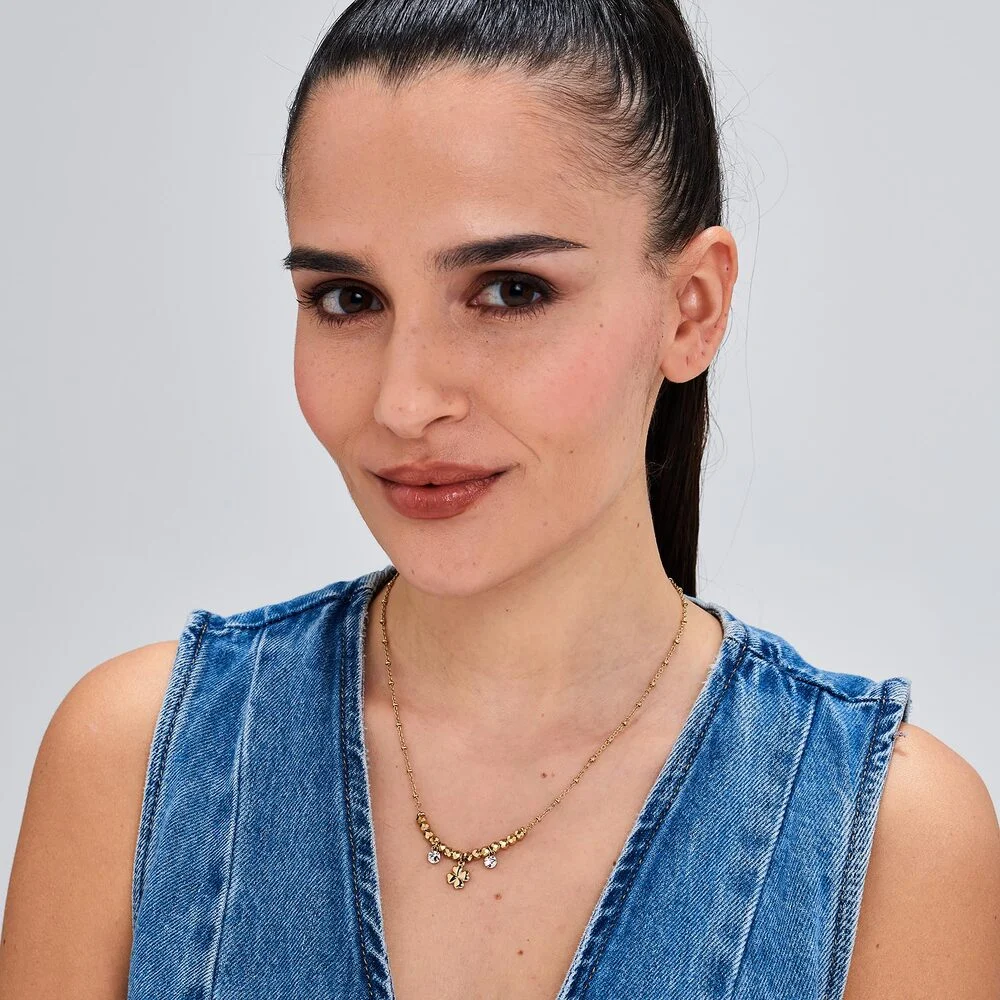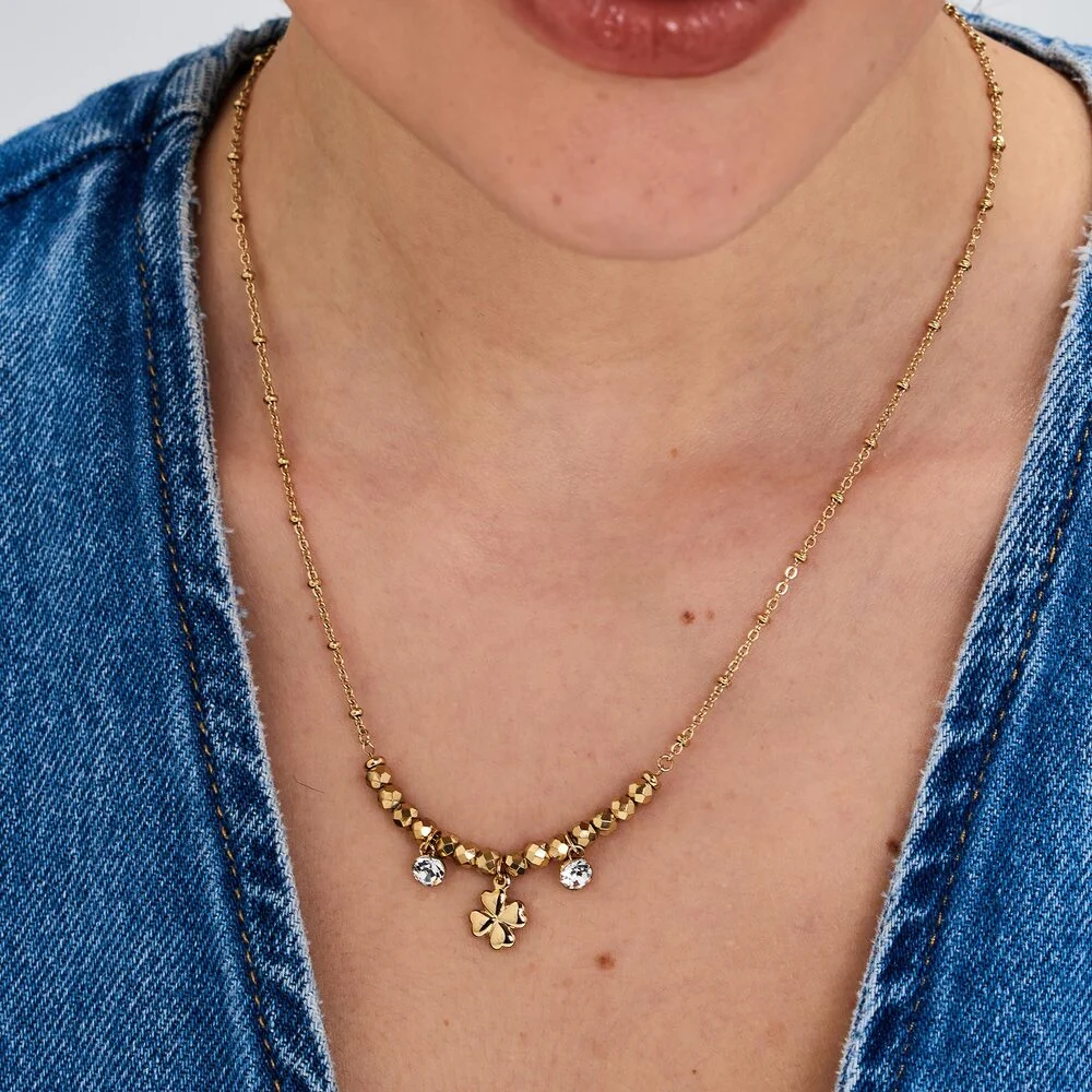 Elegantní náhrdelník Chakra značky Brosway je elegantní a moderní doplněk určený pro ženy. Je vyroben z kvalitní chirurgické oceli 316L, která zajišťuje dlouhou životnost a odolnost.Náhrdelník je potažen zlatým PVD povlakem, čímž vytváří pocit zlatého šperku. Je ozdoben čirými kameny a středového přívěsku ve tvaru čtyřlístku, které dodávají jemný a sofistikovaný vzhled. Náhrdelník je ideální pro každodenní nošení i speciální příležitosti.
