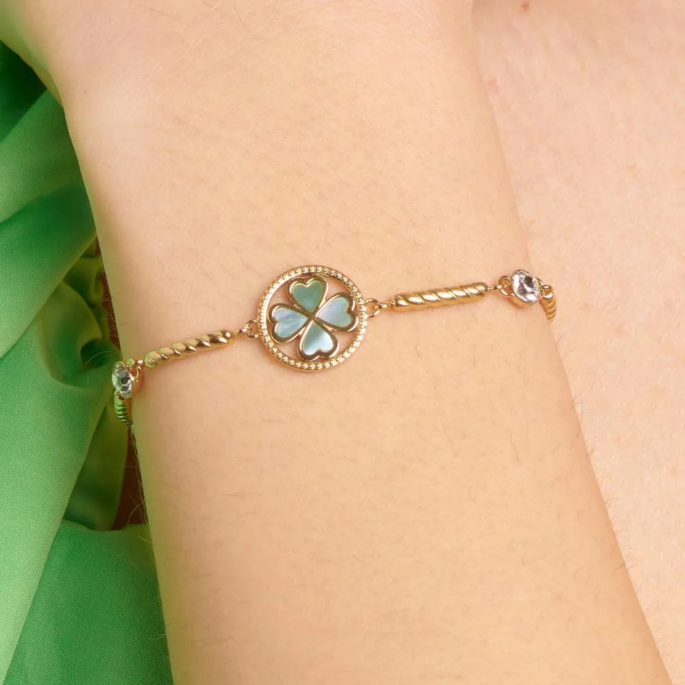 Stylový náramek Chakra značky Brosway je elegantní a moderní šperk určený pro ženy. dokonale kombinuje krásu perleťových a bílých kamenů s odolností chirurgické oceli 316L, potažený zlatým PVD povlakem.zdobený ozdobou ve tvaru čtyřlístku, který je upraven perletí. oslnivý třpyt šperku dodávají čiré krystaly. stane se stylovým doplňkem každodenního outfitu. tento náramek je ideální volbou pro ženy, které hledají jemný, ale zároveň výrazný šperk.
