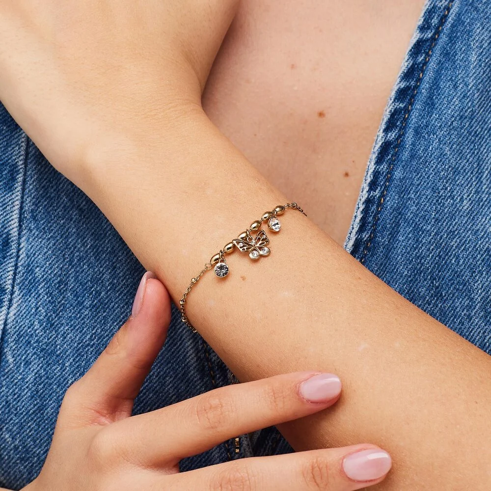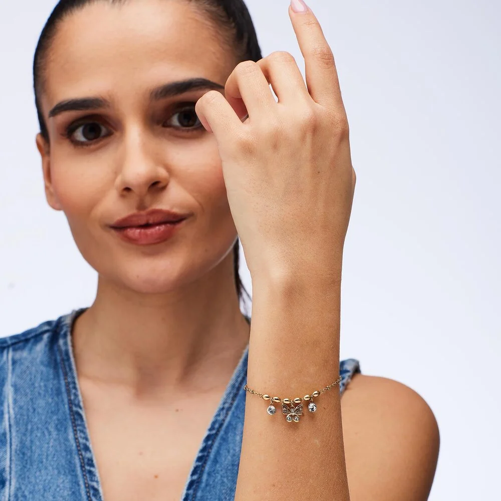 Něžný náramek značky Chakra Brosway je elegantní doplněk pro ženy, který kombinuje styl a sílu. Je vyroben z kvalitní chirurgické oceli 316L, díky čemuž je odolný proti poškrábání. Je potažen zlatým PVD povlakem.Jemný řetízek je zdoben třpytivými čirými krystaly. Půvabná ozdoba ve tvaru motýla je doplněna o drobný přívěsek ve tvaru srdíčka. Tento náramek je ideálním kouskem pro každodenní nošení i speciální příležitosti.
